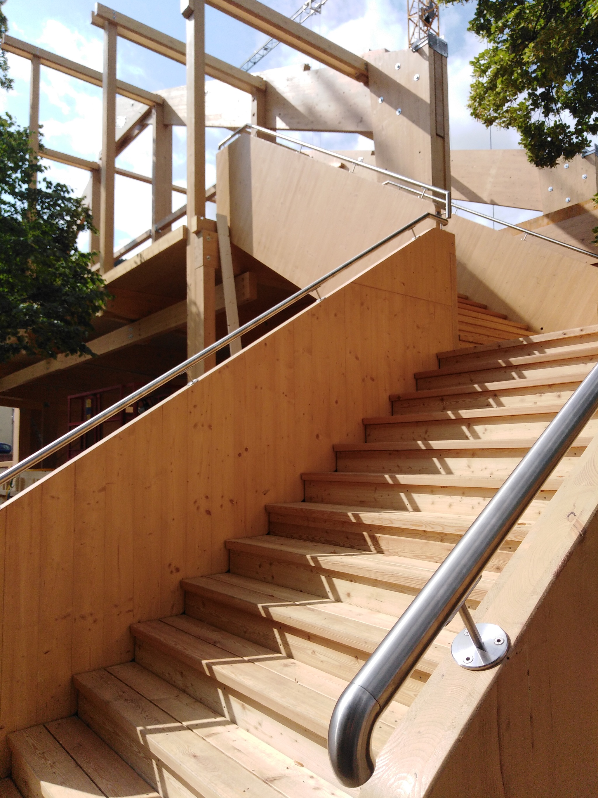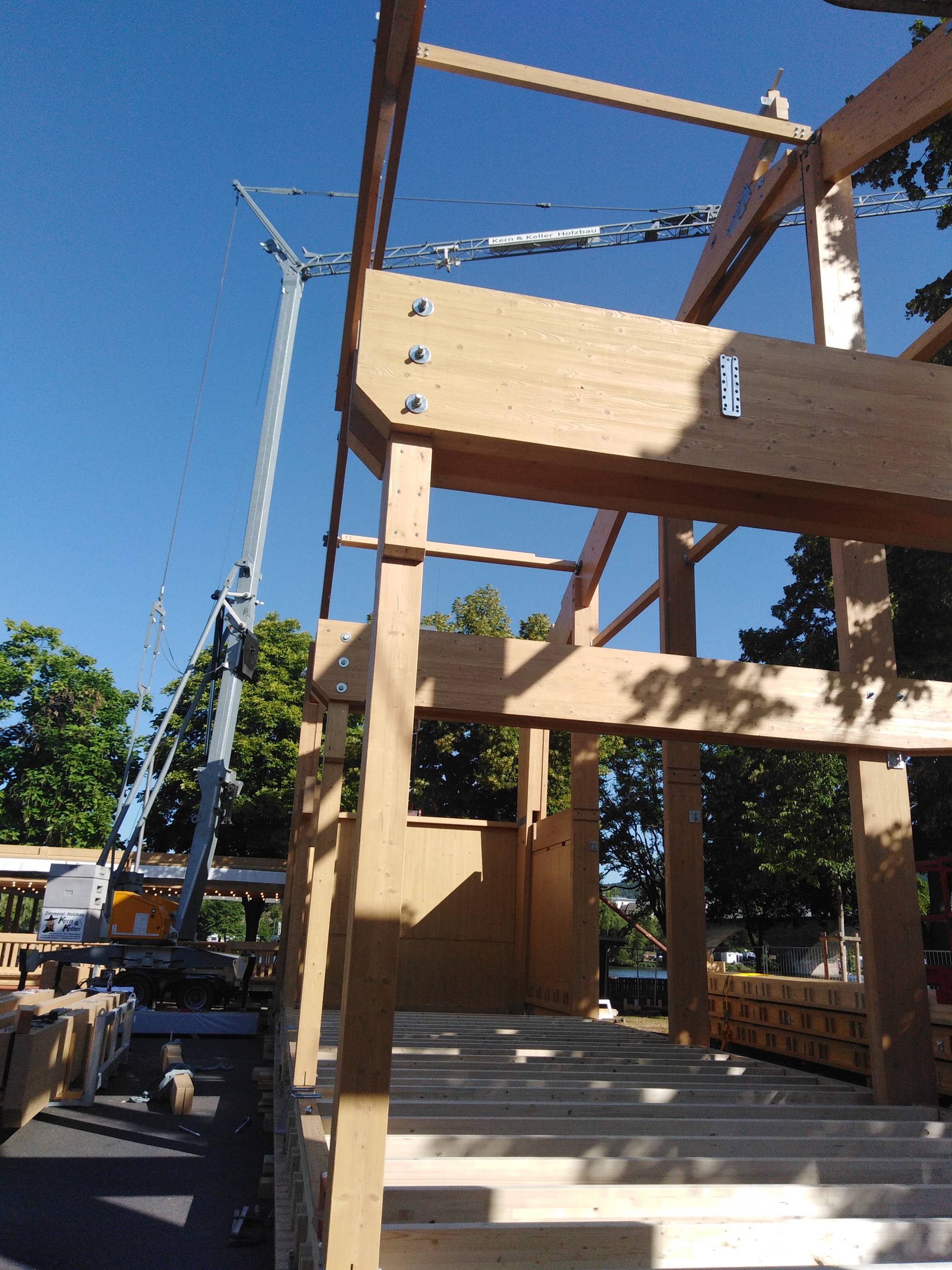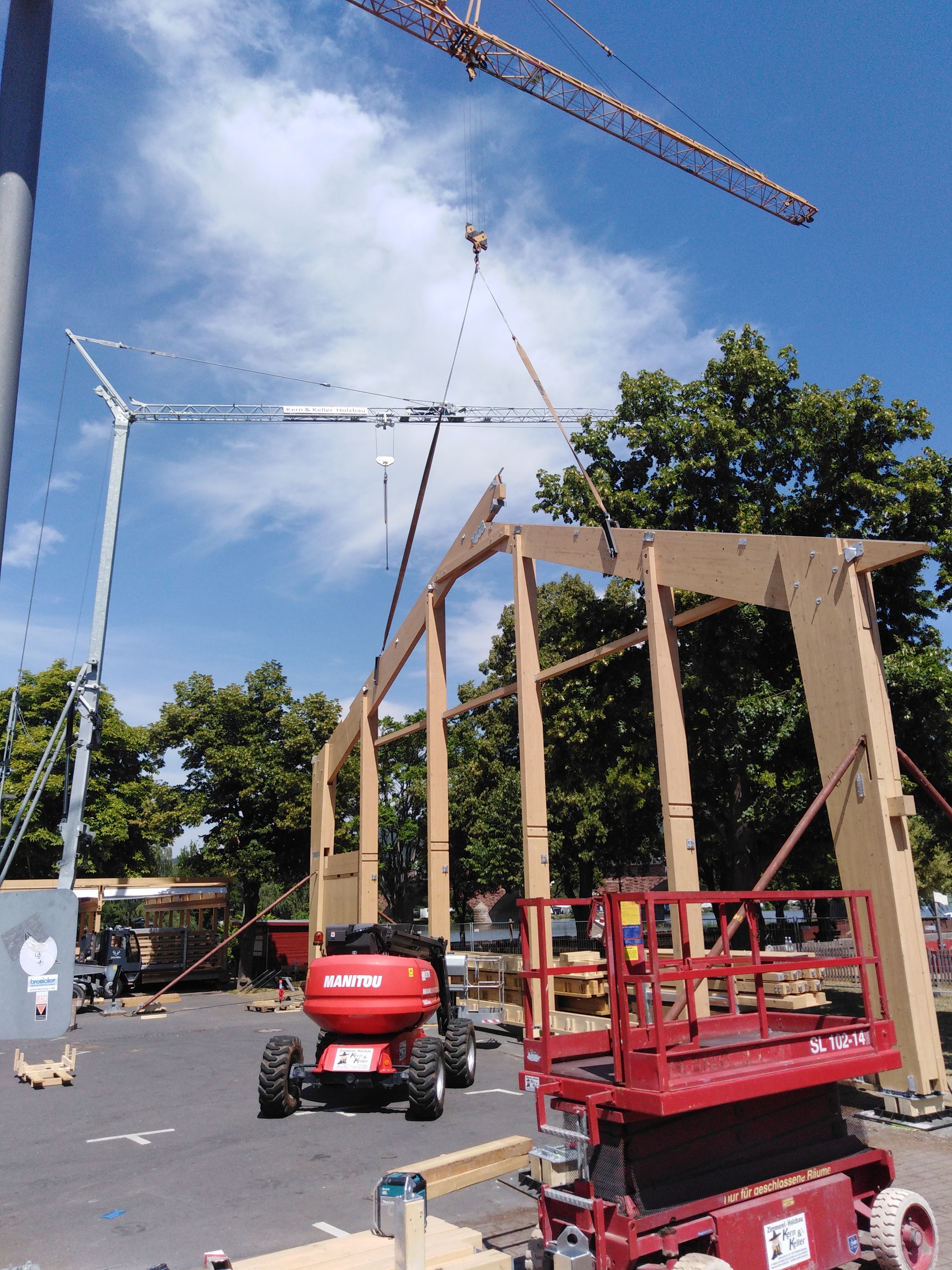 Tag 3: Am Mittwoch wurde mit der oberen Etage unseres Messezeltes begonnen; die erste Treppe steht auch schon.